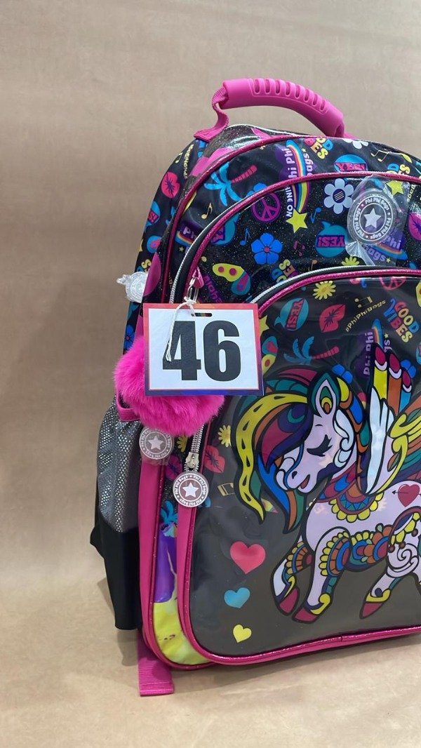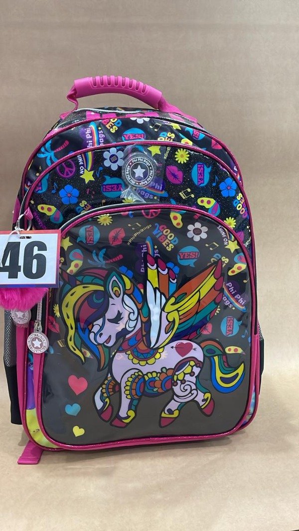 Mochila de unicornio negra y fucsia con pom pon, contiene 3 bolsillos y dos laterales